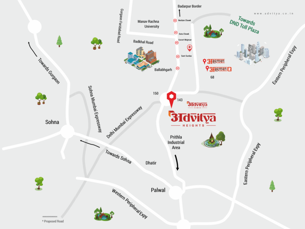 Aditya Heights Faridabad is located on Delhi-Mathura Road (NH-2) between Kailgaon and Sikri, Sector 143, Faridabad, adjoining Advitya Homes. Aditya Homes and Advitya Heights are directly connected to Delhi, Gurgaon, Noida, Palwal, Mathura and Jewar Airport.